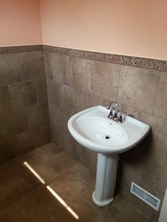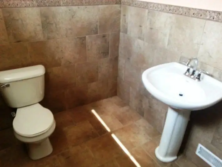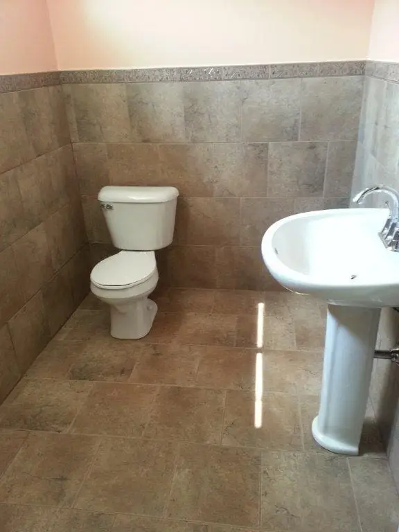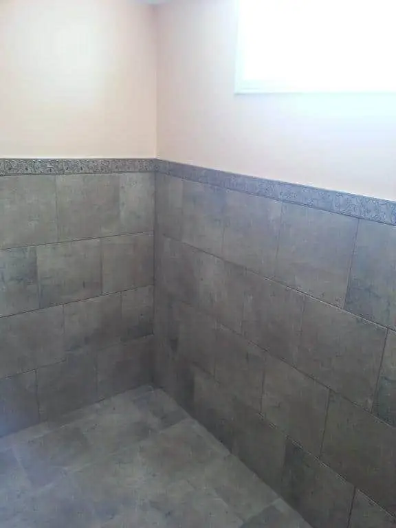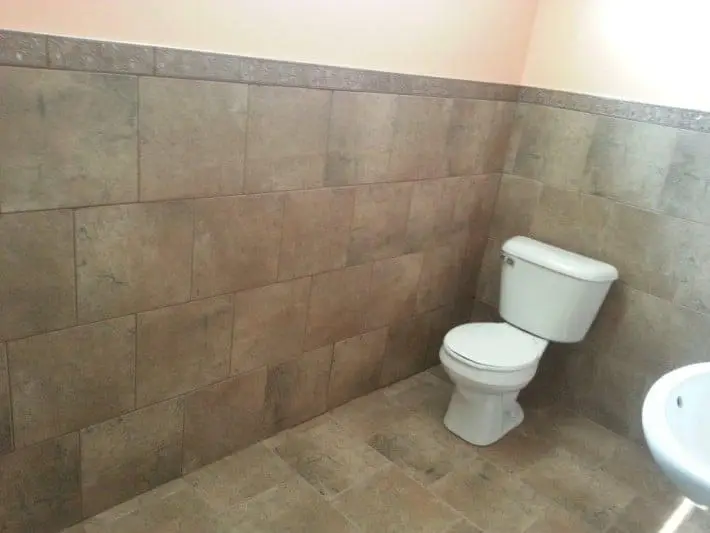 Once we started working on the bathroom, we retiled the entire bathroom. The upper half was a plain wall painted peach. For the lower half, we used a dark color-patterned tile. The lower half tiling and the flooring had the same tiles used. Alongside this, we also installed a toilet and a small sink in the bathroom space.