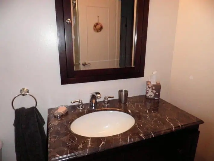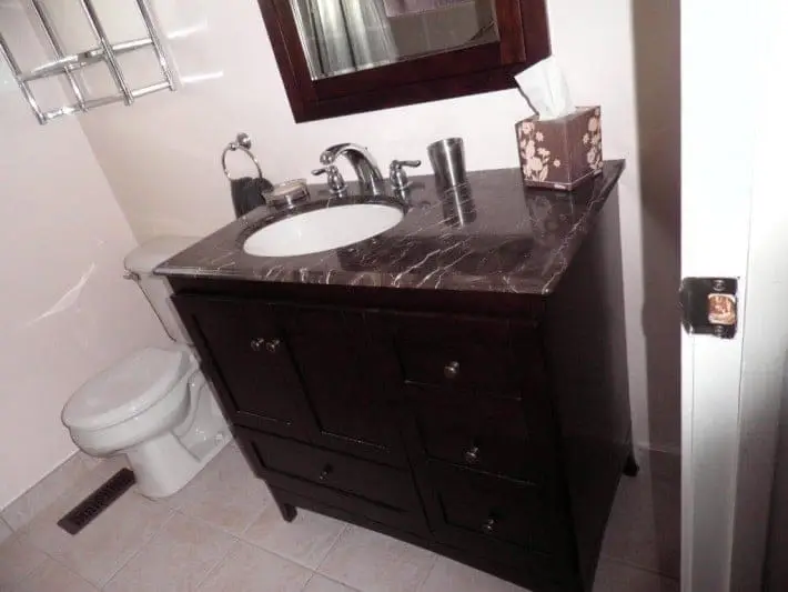 Our client had already picked out a gorgeous solid wood vanity with an under-mount sink, which was already pre-assembled. So, we installed it and had the sink functioning in no time. We then installed the white toilet. At this point, all that was left were the small fixtures, which we installed in no time, which included the mirror and lighting fixtures.