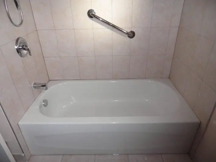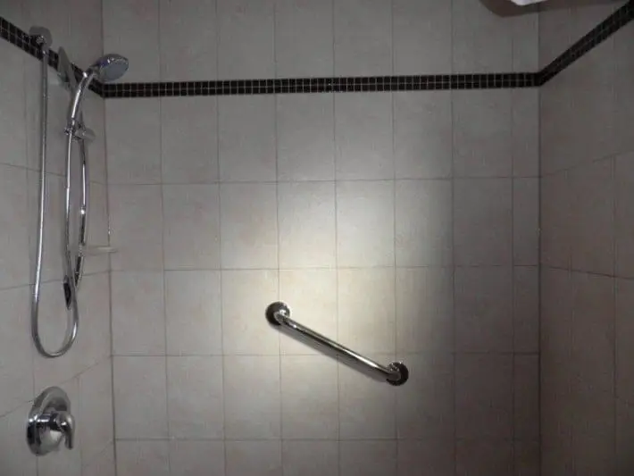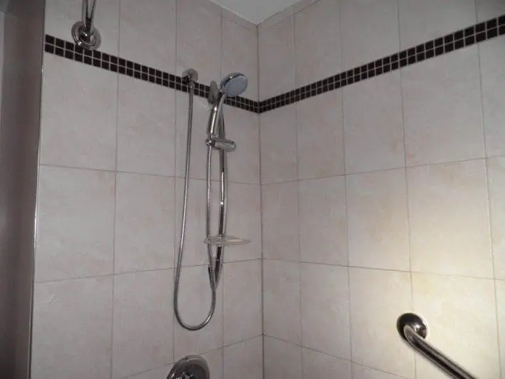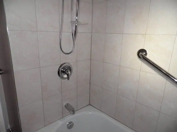 We then began working on the shower space, within which we installed a white acrylic bathtub along with stainless steel shower faucets. As a safety feature for our client, we also installed a grab bar. Finally, as the bathroom was to be a shared one, we installed a shower curtain rod.