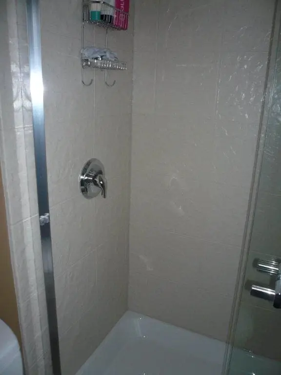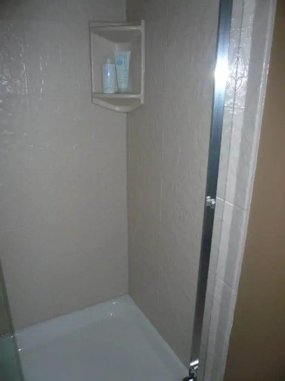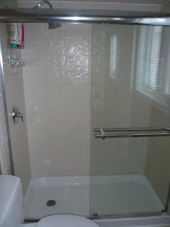 In our project of bathroom renovation services at Sheenboro, Orleans. We began by installing textured cream tiles on the shower walls and created a ceiling panel. Next, we installed a white acrylic shower base as our client no longer wanted the bathtub. Creating a shower base helped in opening up the space and making it look bigger than it was. We then installed an acrylic corner caddy and finished off the shower space by building a sliding glass door.