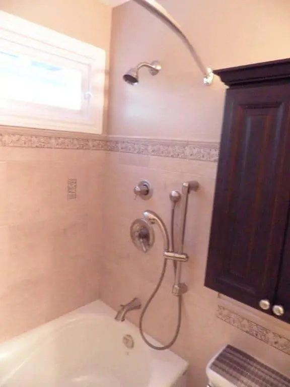 The tiles were placed along the tub walls, thus making it stand out. Another thing our team added was sliding rails and a hand shower, both of which were added to maximize functionality within the bathroom.