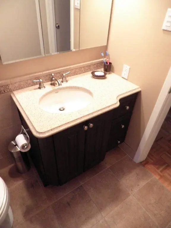 We also installed a custom angled front vanity to this bathroom which was also custom-made and was installed to increase storage space within the bathroom. To match with this, we also added a beautiful countertop made of quartz along with an under-mount sink for the bathroom.