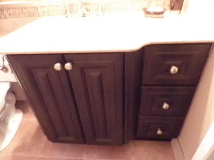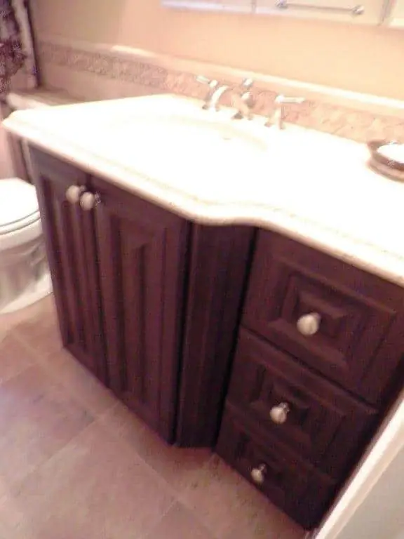 A utility cabinet matching the vanity was installed over the toilet, further increasing storage space. We also added an 8″ widespread lavatory faucet.