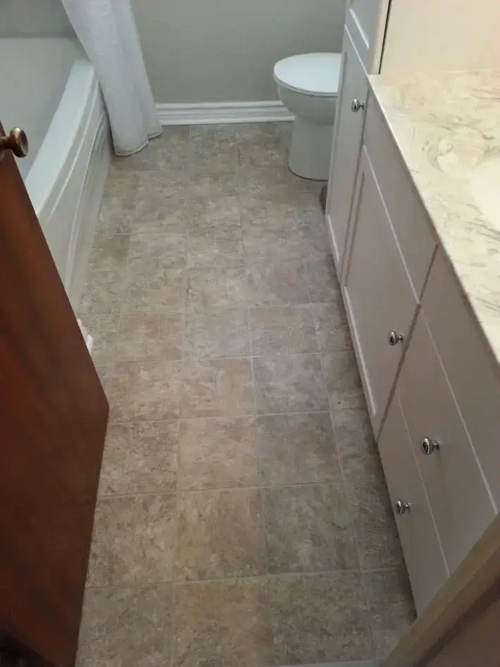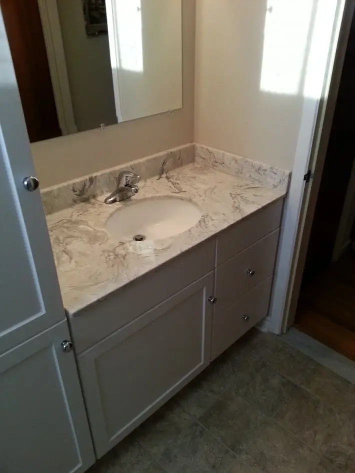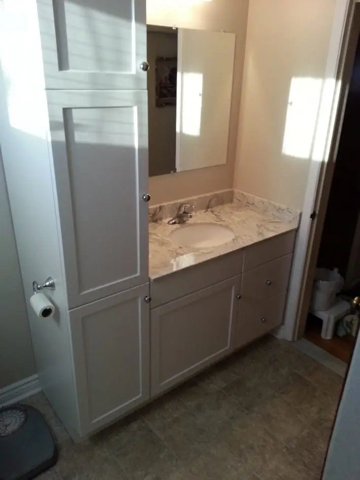 Once these additions were done, we also added a new vanity with a marble countertop for the sink with an undermount sink. A small cabinet area was also created next to the vanity to allow for further storage space addition.